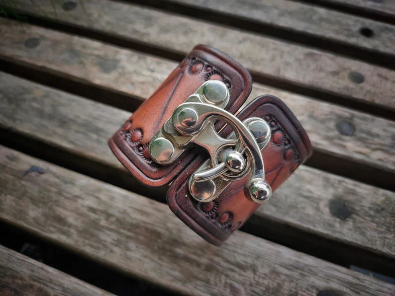 Introducing a masterpiece in craftsmanship - a legendary Discover the elegance of our handmade natural veg-tanned leather cuff. Each piece is meticulously hand-tooled and stamped, evoking the timeless beauty of drum motifs. Our dedication to traditional leather crafting techniques ensures no electric tools are used, preserving the authenticity of the process.