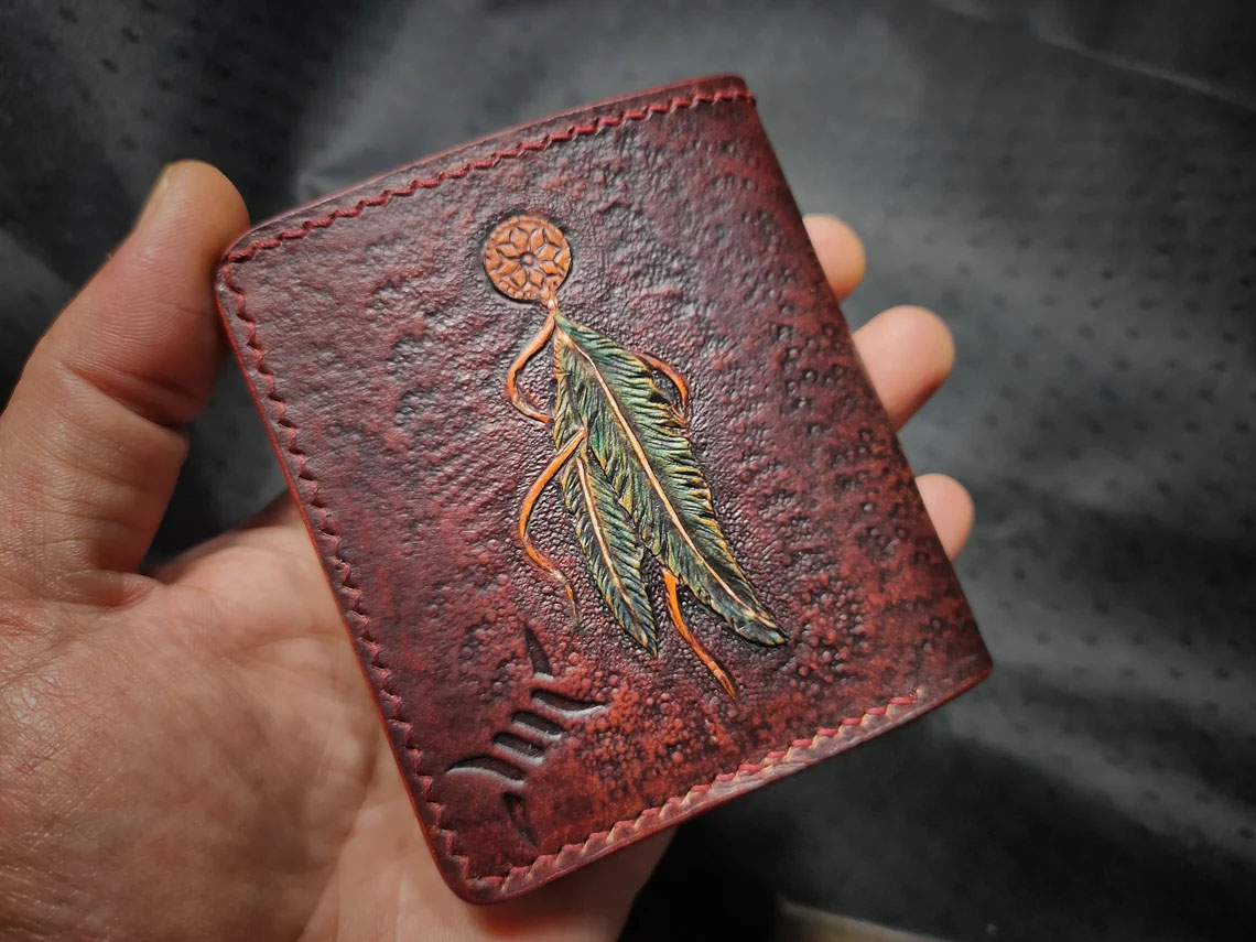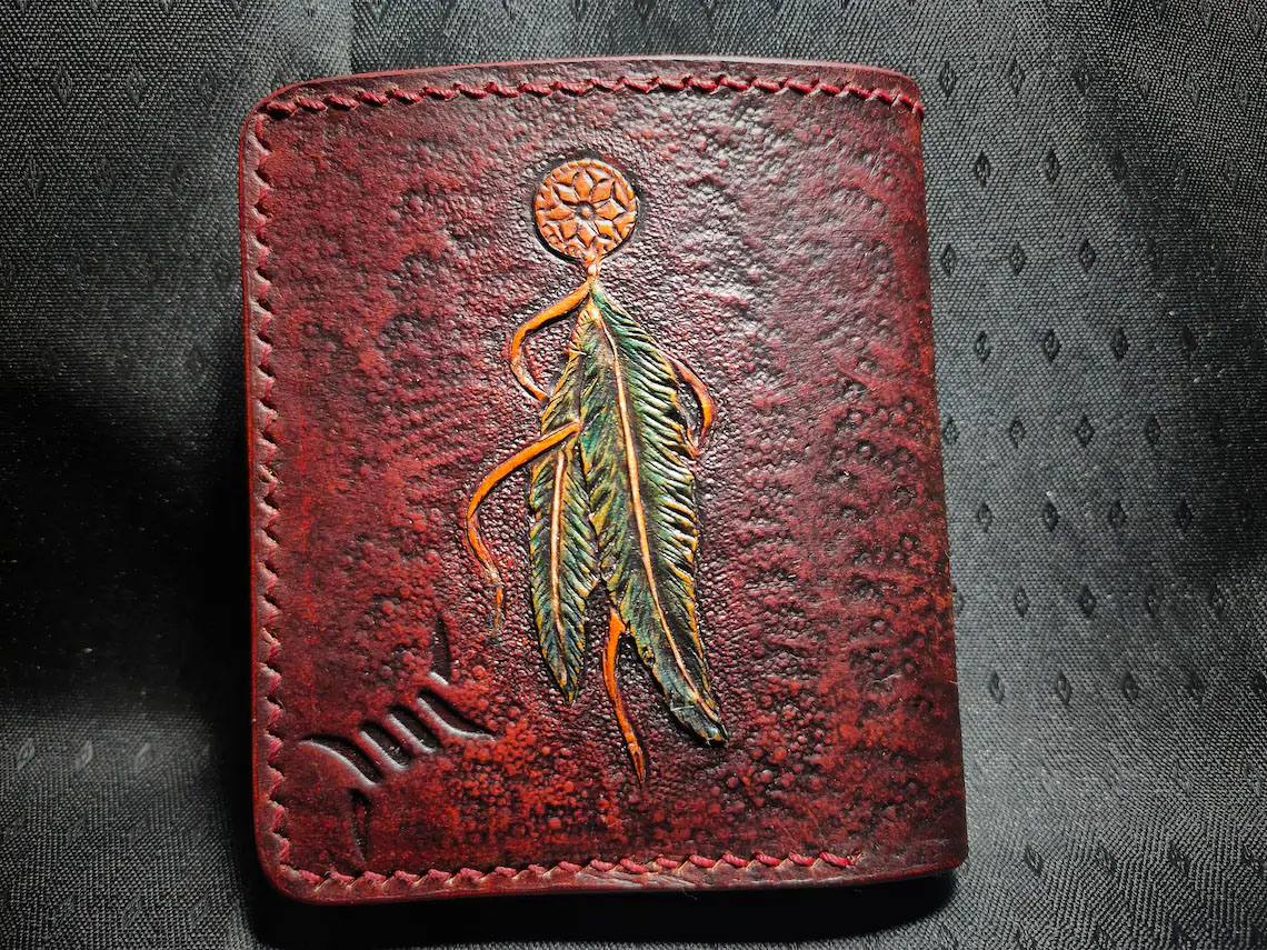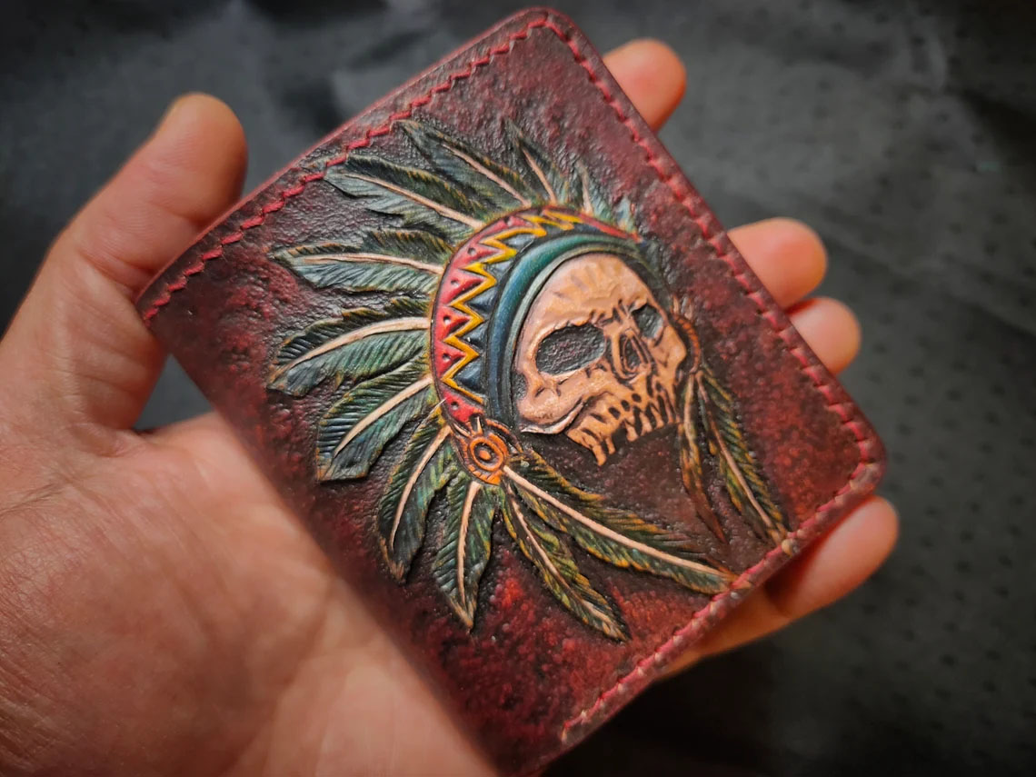 Discover the intricate beauty of our carved Indian skull and dreamcatcher bifold wallet, crafted from fine vegetable-tanned leather. This wallet is a true masterpiece, adorned with exquisite details that capture the essence of traditional craftsmanship.