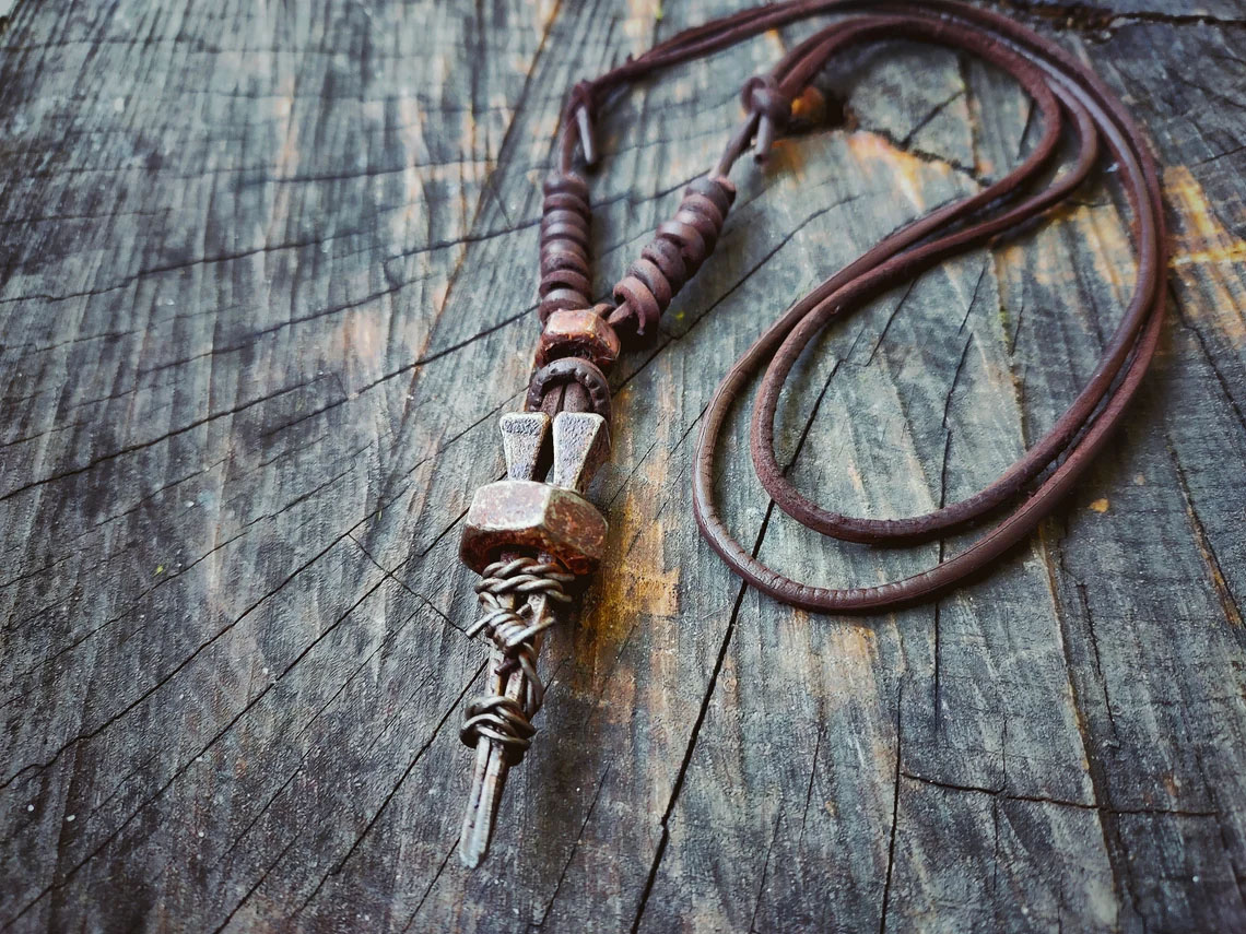 Explore our unique handcrafted pendant necklace, made from genuine full vegetable-tanned leather. The side ornaments and cord are meticulously crafted, featuring barbed wires, nails, and a nut made of steel with an authentic rusty patina.